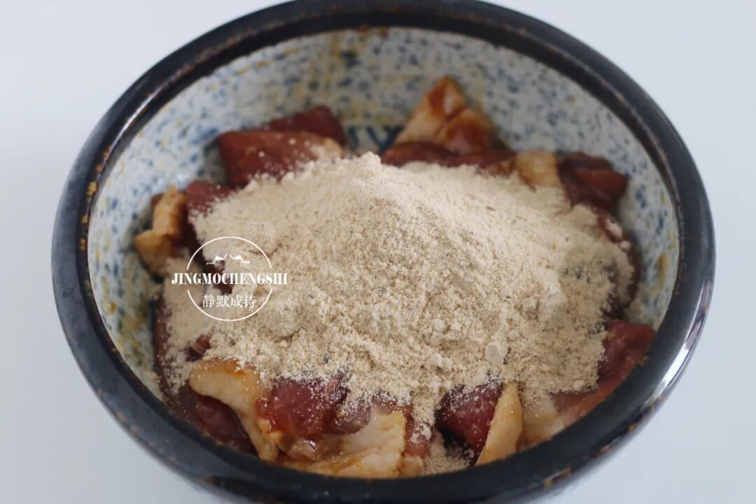 第12步:五花肉片腌制一个小时左右之后,把蒸肉米粉倒进去,根据肉片的多少酌情加入。