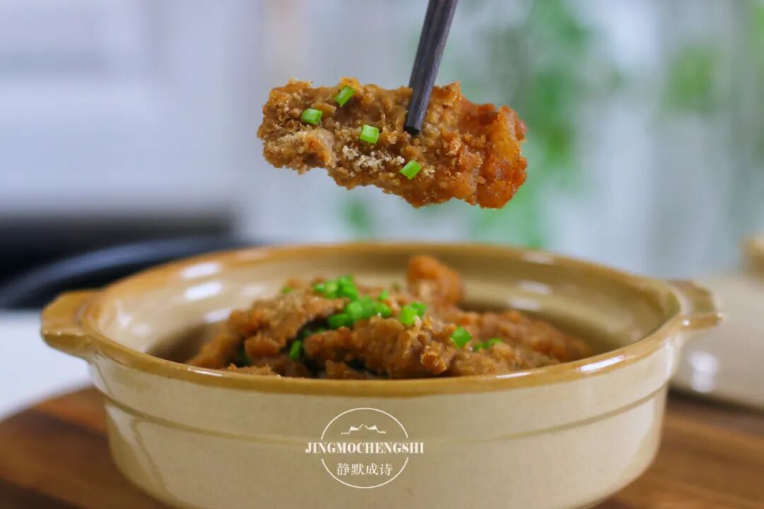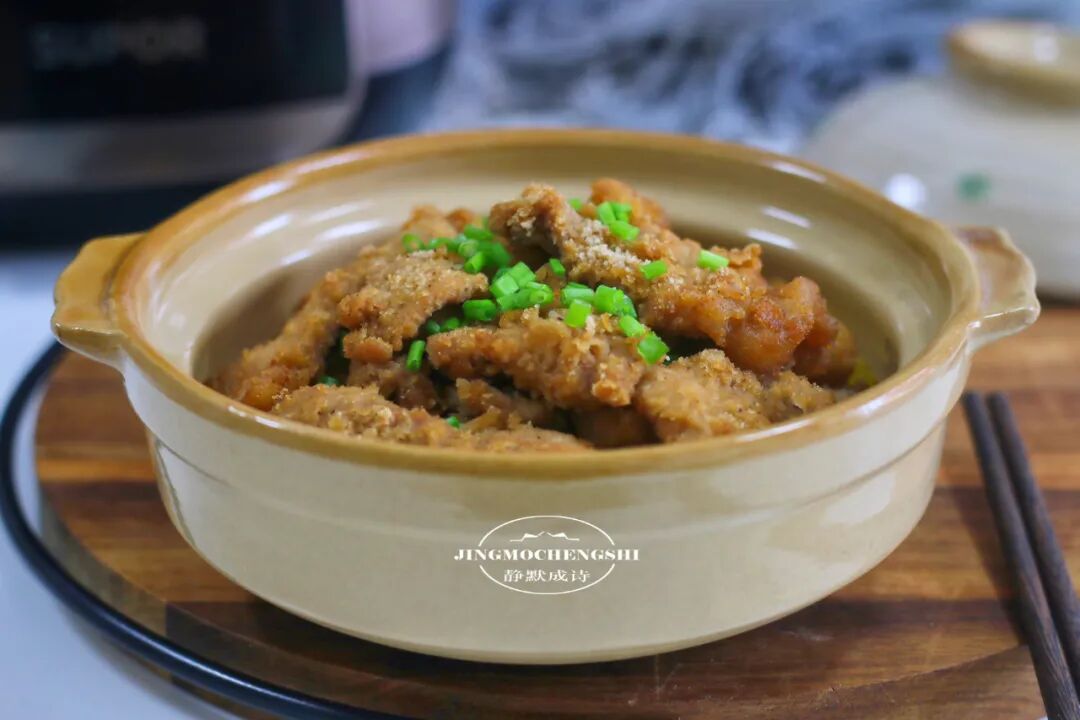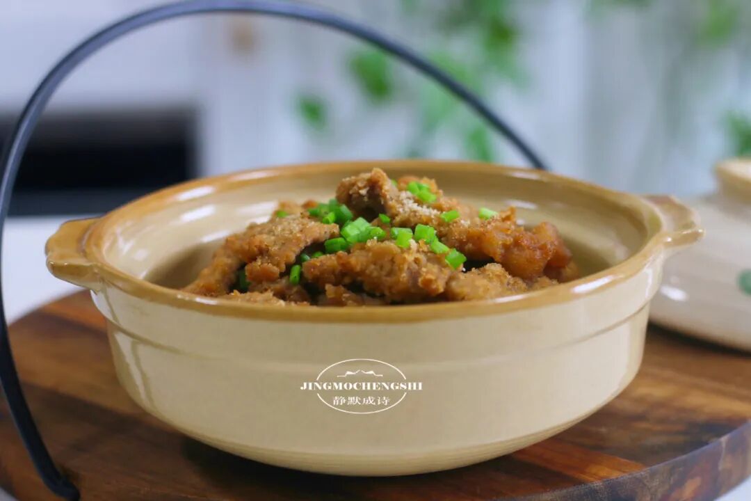 第17步:粉蒸肉上桌前,再撒上一小撮葱花来点缀一下,这道硬菜就完成了。