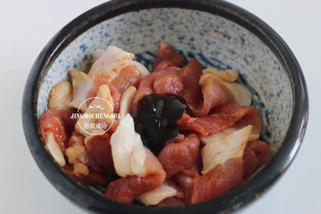 第2步:切好的五花肉片中加入鲜酱油、料酒、蚝油、白胡椒粉和少许盐。