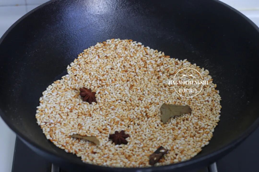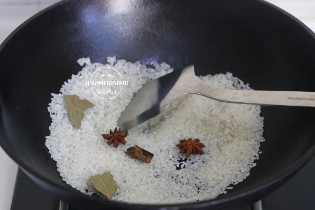 第6步:把大米和八角香叶桂皮全部倒进无油的炒锅里,加点儿盐进去,小火翻炒。