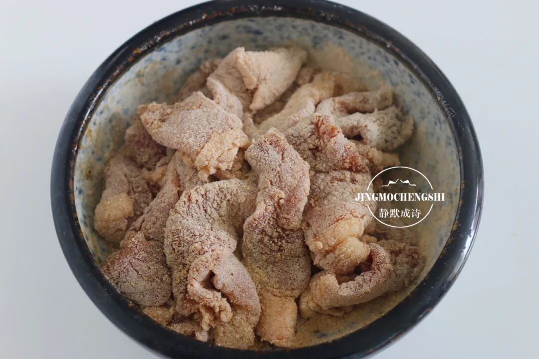 第13步:把肉片与米粉充分拌匀,让每一片肉都被米粉薄薄的包裹起来。