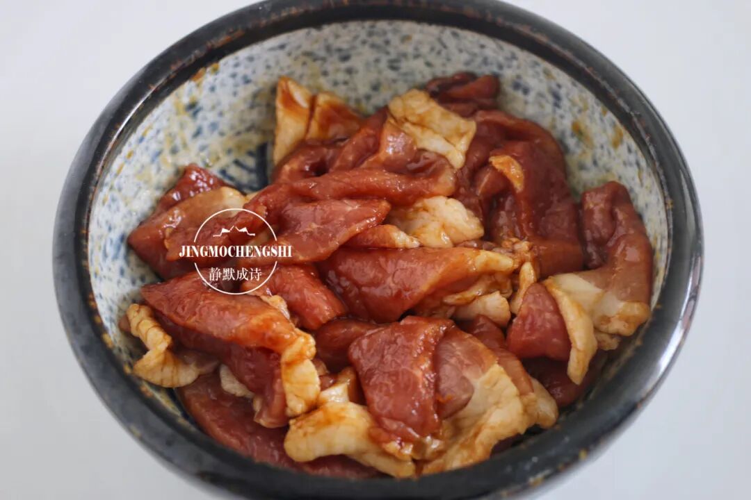 第3步:把五花肉片与调味料拌匀之后腌制1个小时左右。腌制的时间与肉片的厚度成正比,切的越厚,腌制的时间就要越长。