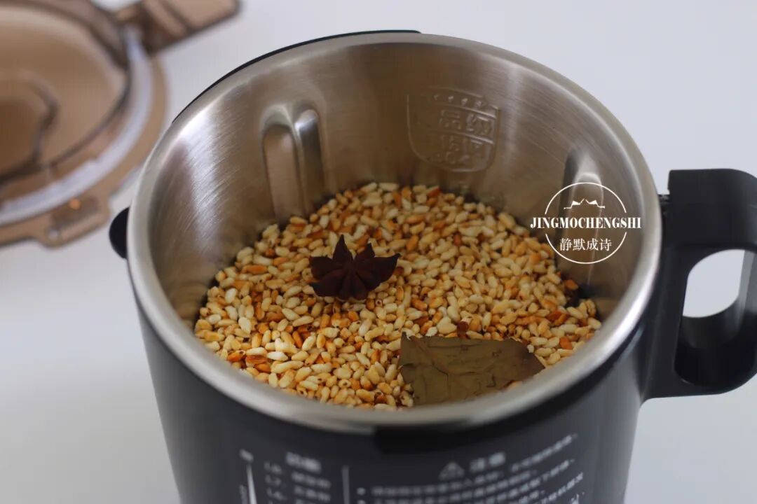 第8步:把炒过的米连同八角等香料全部放进苏泊尔可拆洗静音破壁机的干磨杯中(行业内第一款可拆洗静音破壁机,快拆好洗,静音好用),对,香料也要全部放进去。米粒在炒至微黄的同时,香料也被炒熟炒香,我们要把米连同香料一同打成粉,这粉的味道才更香。
