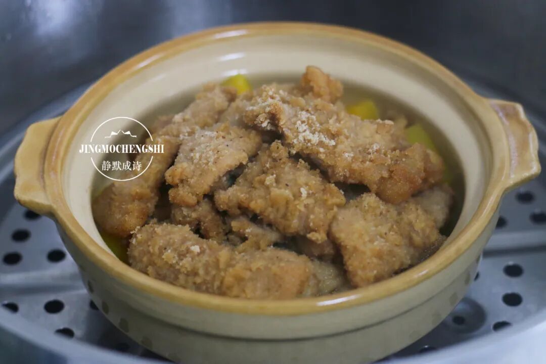 粉蒸肉,是汉族传统名菜,广泛流传于中国南方地区,主料为五花肉,加之米粉以及其他调味料制作而成,配料多是南瓜、红薯、土豆、芋头和莲藕。粉蒸肉有肥有瘦,肥而不腻,入口软滑,糯而清香,嫩而不糜,米粉油润,香味儿浓郁,回味无穷,可偏甜,亦可偏辣,按个人口味而定。