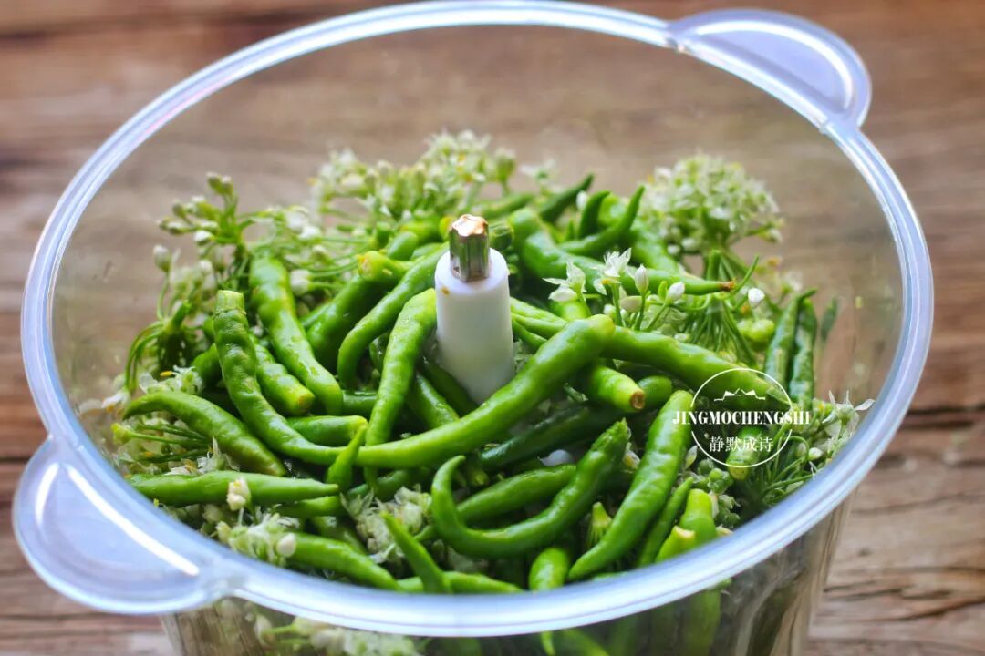 【食材准备】:韭菜花500克、青辣椒1把(不吃辣可以不加)、盐100克、苹果和梨各1/3个、生姜1小块儿、白酒少许。