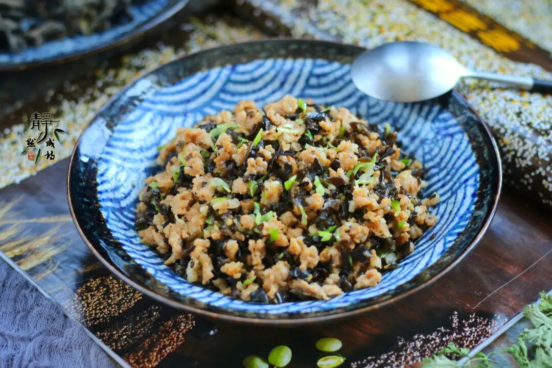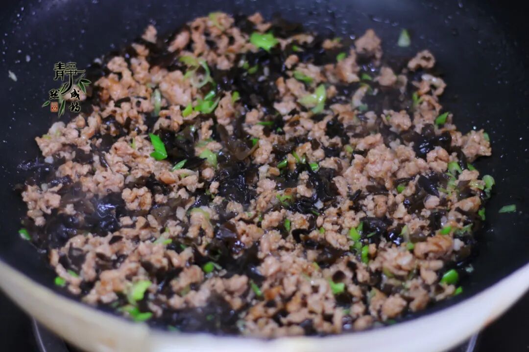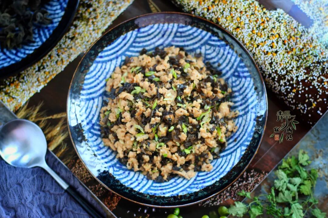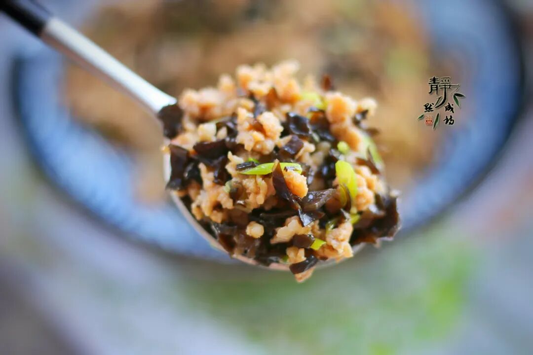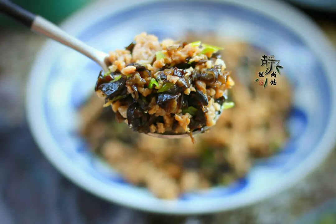 【食材】:猪肉末100克、黑木耳(干)1小把、葱半棵、淀粉1汤匙、酱油1汤匙、黄酒半汤匙、香油1汤匙、油盐适量。