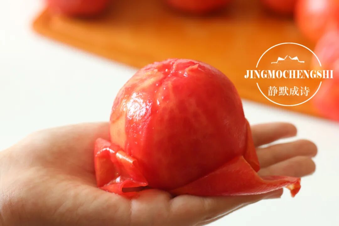 3、把划了十字的西红柿放开水锅里烫几秒捞出,然后就能轻松撕掉它的外皮了。