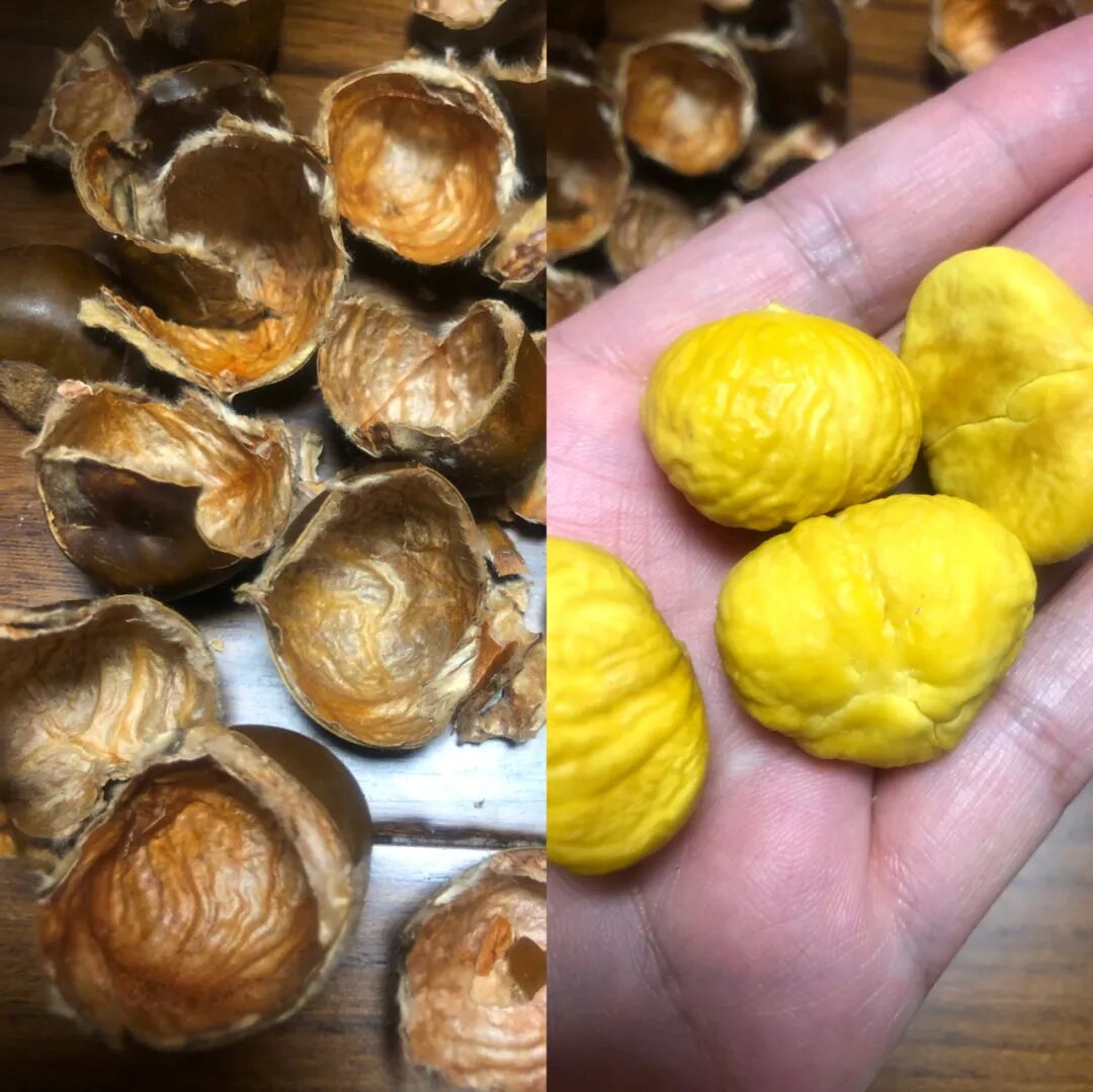 还有一点差点儿就忘记说,油栗晒1-2天之后再剥皮就非常容易,而且栗肉上的那层褐色的内皮也会跟着栗子的外壳干燥在一起,剥出来的栗肉特别干净。