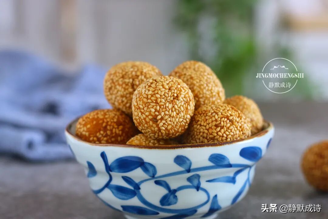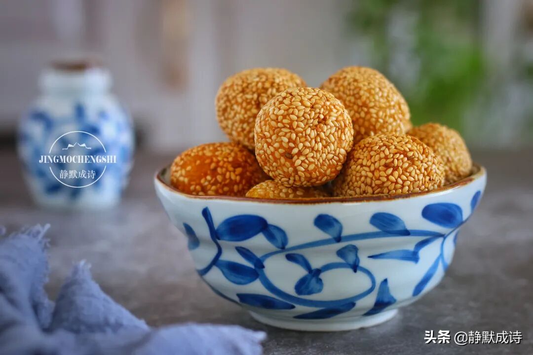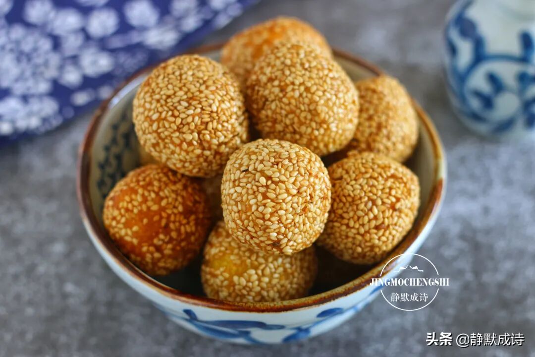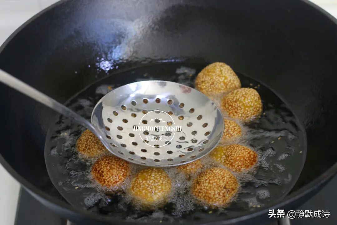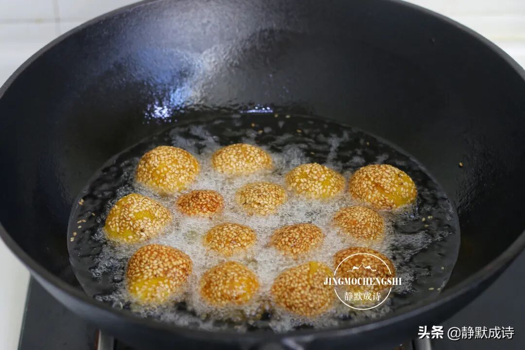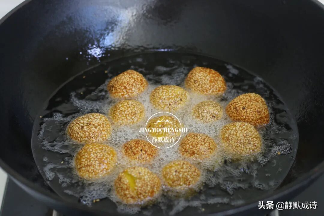 8、如果想吃空心的芝麻球,就需要不断地轻轻按压它。