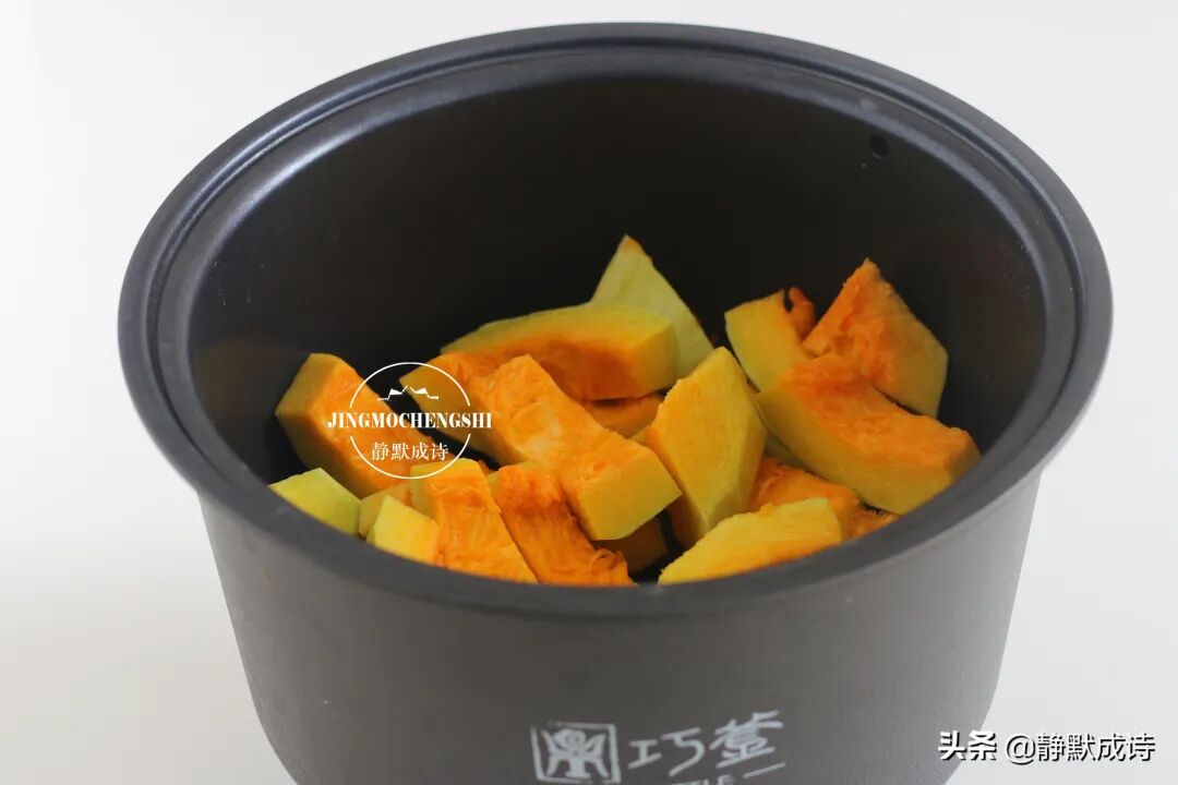 3、把南瓜隔水蒸熟,我用的巧釜的电饭煲,比较火的一款厨房电器,焖饭蒸食物都可以。