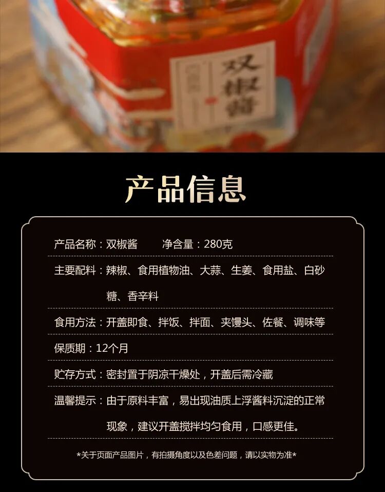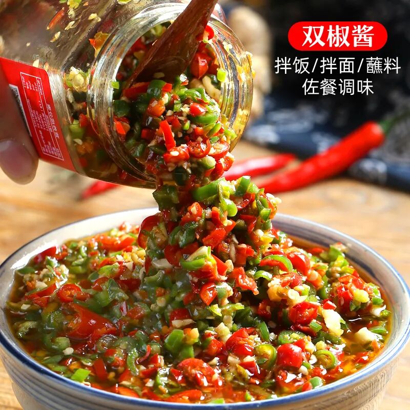 它是双椒酱,又香又辣,而且没有防腐剂。这款双椒酱精选优质青红辣椒和蒜蓉,采用黄金配比传统工艺手作而成,蒜香浓郁,辣味儿清新。可拌饭可拌面,更能配着馒头烙饼吃。