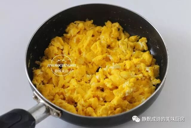 2、鸡蛋打散,充分搅拌均匀,下油锅,小火煎成鸡蛋块儿。鸡蛋下锅就需要不停地搅拌翻炒,这样炒成的是小块儿,非常合适。把炒好的鸡蛋晾凉待用。