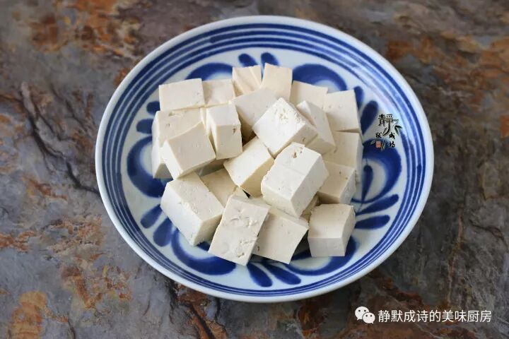 1、先把豆腐切成小方块,我这里用的是北豆腐,用南豆腐也是一样的做法。有人嫌弃豆腐的豆腥气,那就给它焯一下热水。其实吧,我的这个做法中,豆腐即使不焯水也不会有豆腥气。