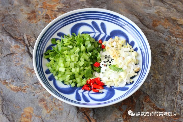 2、葱姜蒜小米椒切碎,香芹洗净后切成小碎段待用。