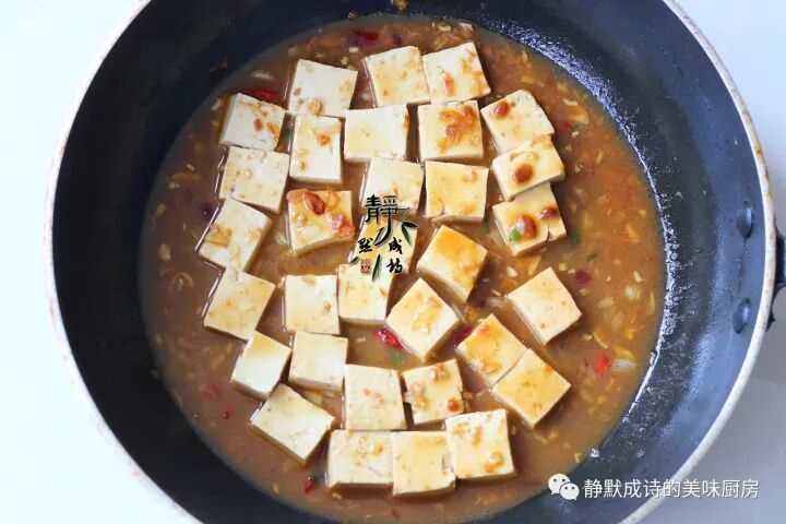 5、接着添加适量清水,放入豆腐,水量与豆腐基本持平即可,盖上锅盖,烧开后转小火再烧上十来分钟。