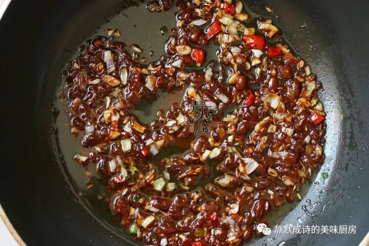 6、最后大火收汁,撒入香芹末,轻轻的翻拌均匀,待香芹末变色后即可关火。我没再另外放盐,因为黄豆酱很咸。