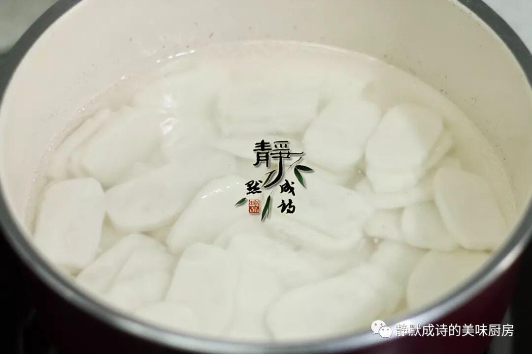4、煮小半锅水,水开后下年糕片。