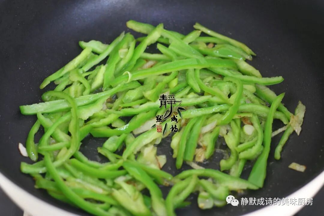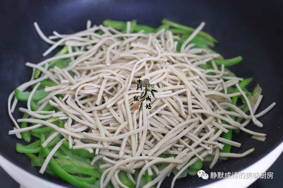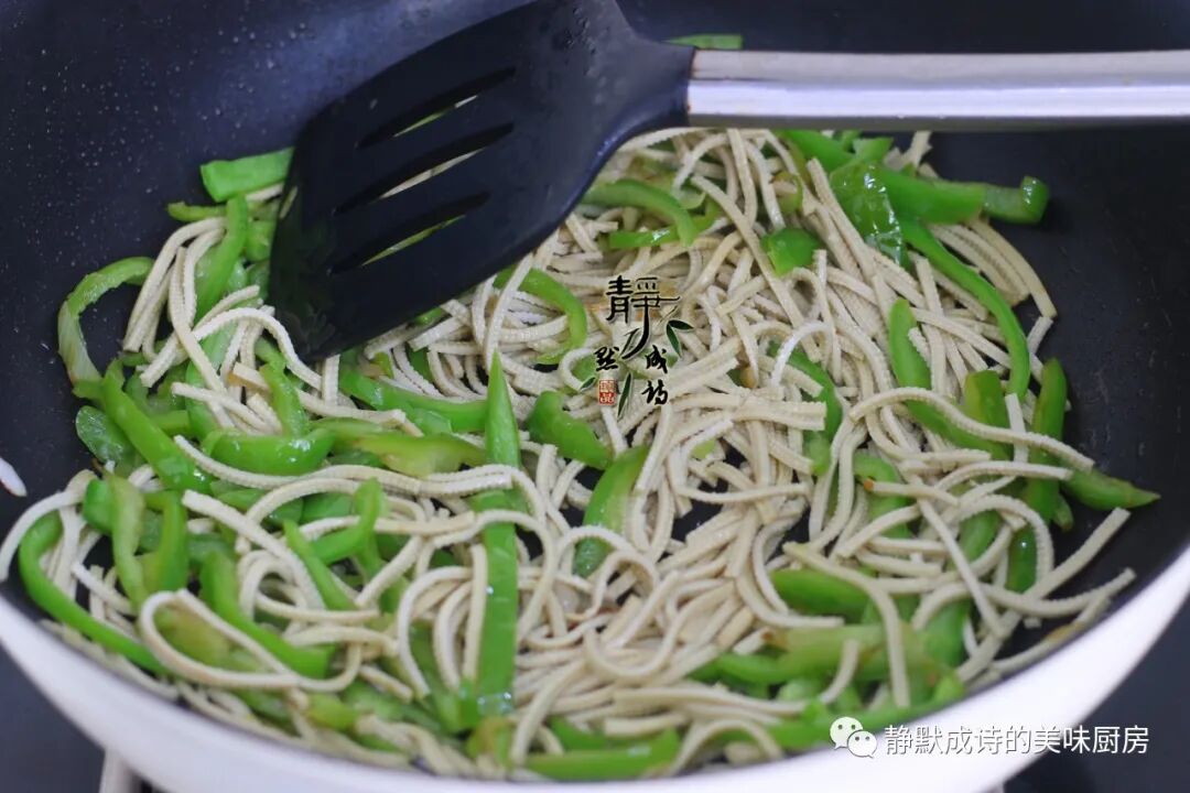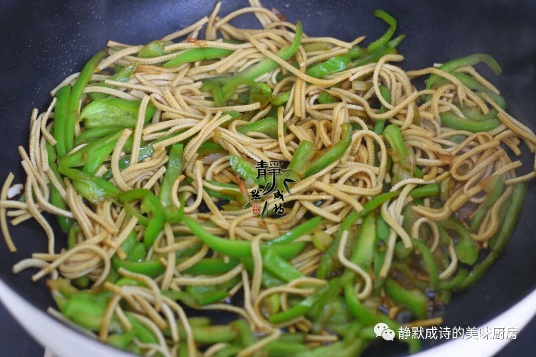 5、不待尖椒变色,即刻加入豆腐丝。待尖椒变色再加豆腐丝的话,尖椒就炒老发软了,影响口感。