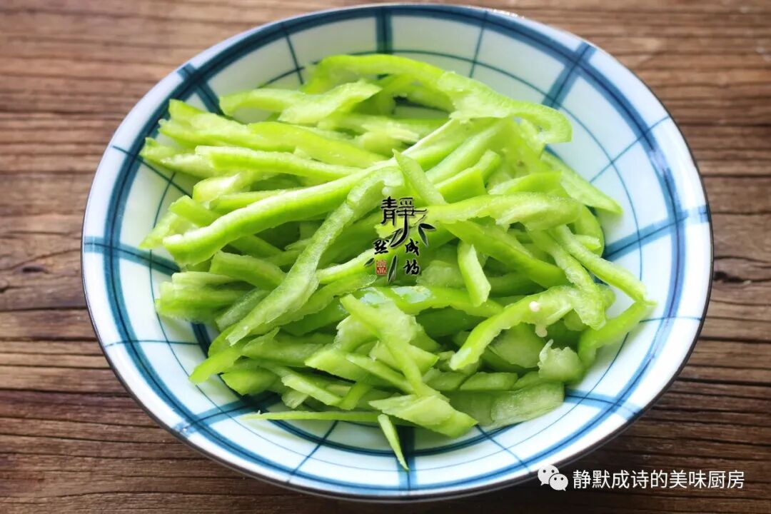 1、尖椒去蒂去籽洗净,拍扁,切成尖椒丝待用。