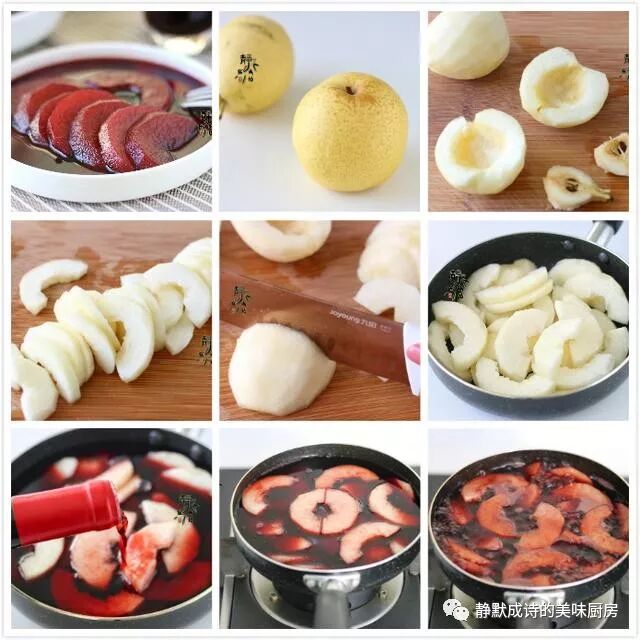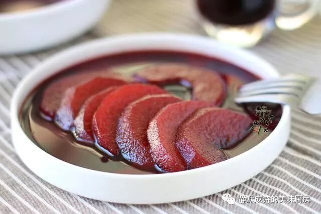 5、用红酒煮过的梨,色泽红亮酒香内嵌,软糯香甜,可润喉养颜;红酒温润,吃掉梨,喝掉挥发掉酒精的红酒,滋味曼妙,味道大好。