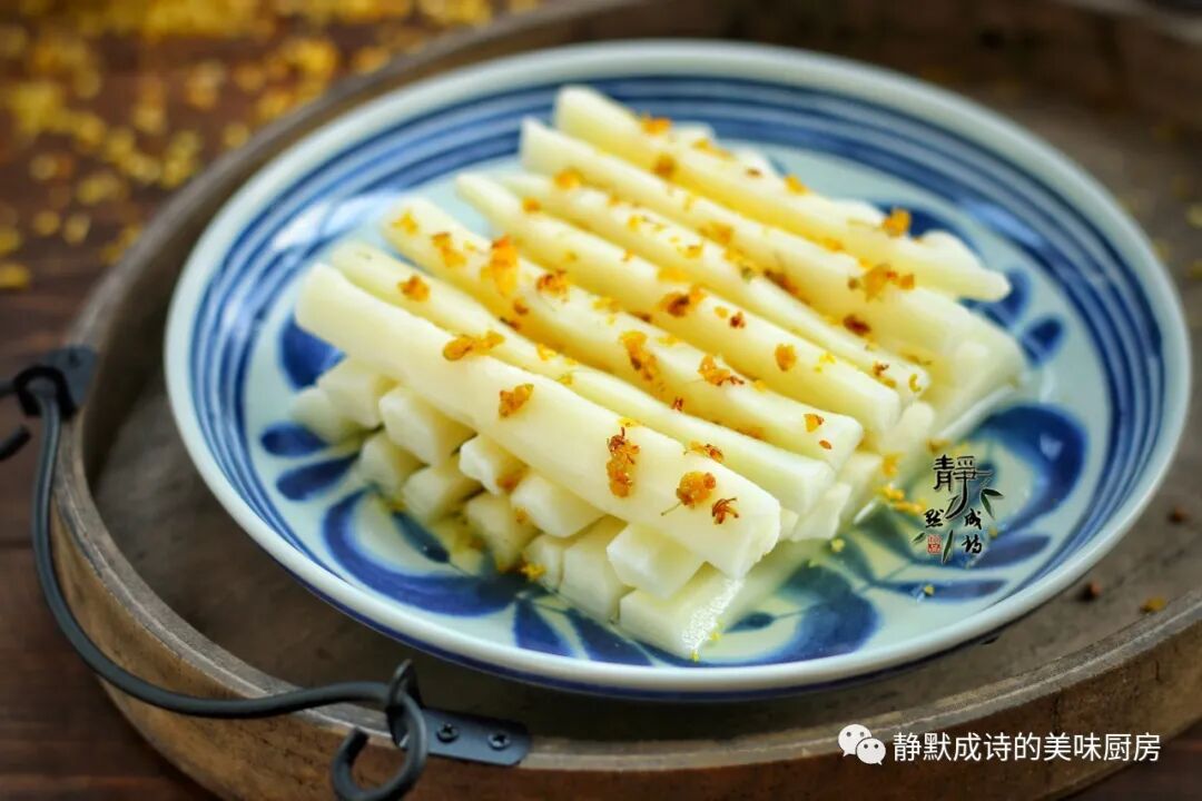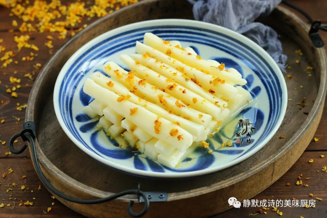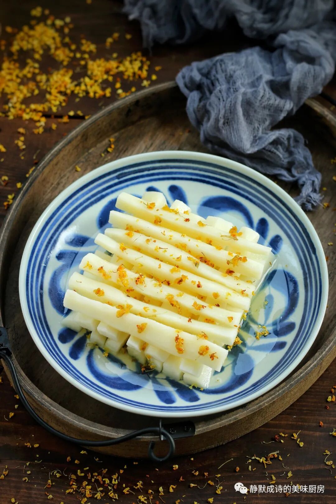 【食材】:铁棍山药1-2根、蜂蜜2汤匙、干桂花(或糖桂花或桂花酱,皆可)1小撮、白醋1汤匙、水淀粉适量。