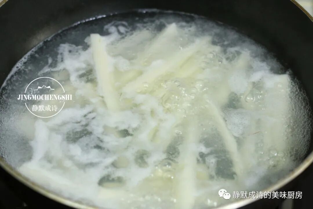 2、在处理山药之前,需要烧小半锅清水。水开后把山药放进去,焯烫两三分钟左右基本就烫熟了。