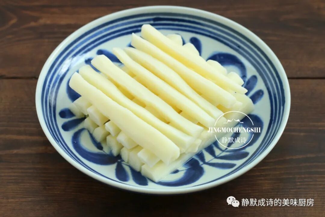 3、把山药捞出来,再过两遍冷水,来增加它清脆的口感(怕凉的可以省略,同样好吃)。然后捞出,沥水,摆成“井”字型,如下图所示。