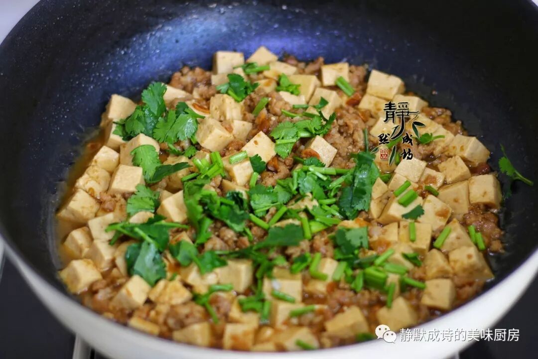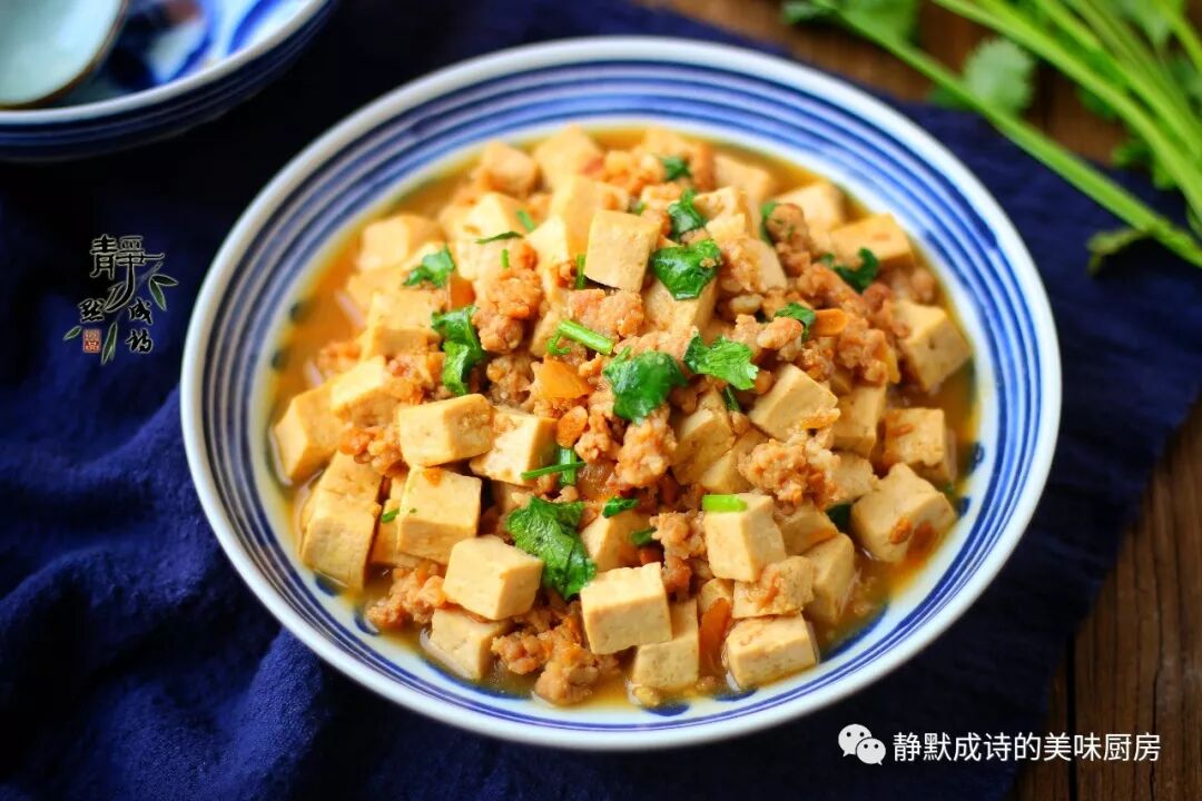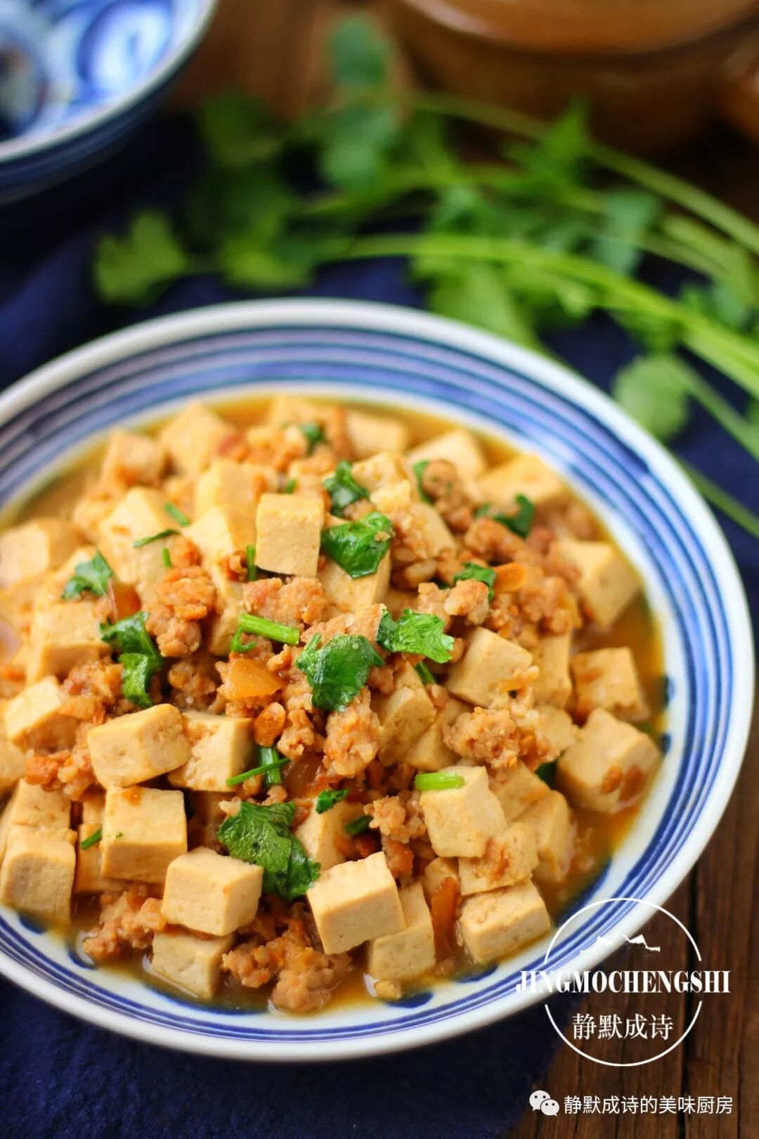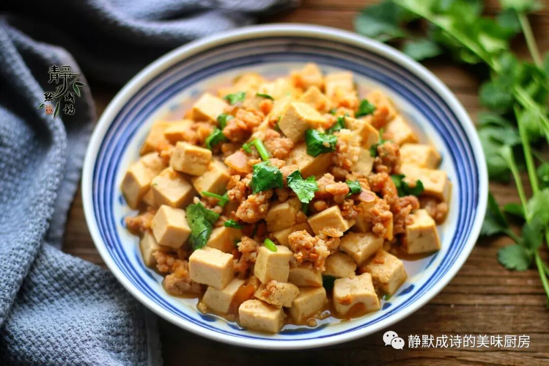 【食材】:北豆腐1块儿、猪肉末适量、黄豆酱1大勺、葱花5克、香菜1棵、淀粉少许、油盐适量。