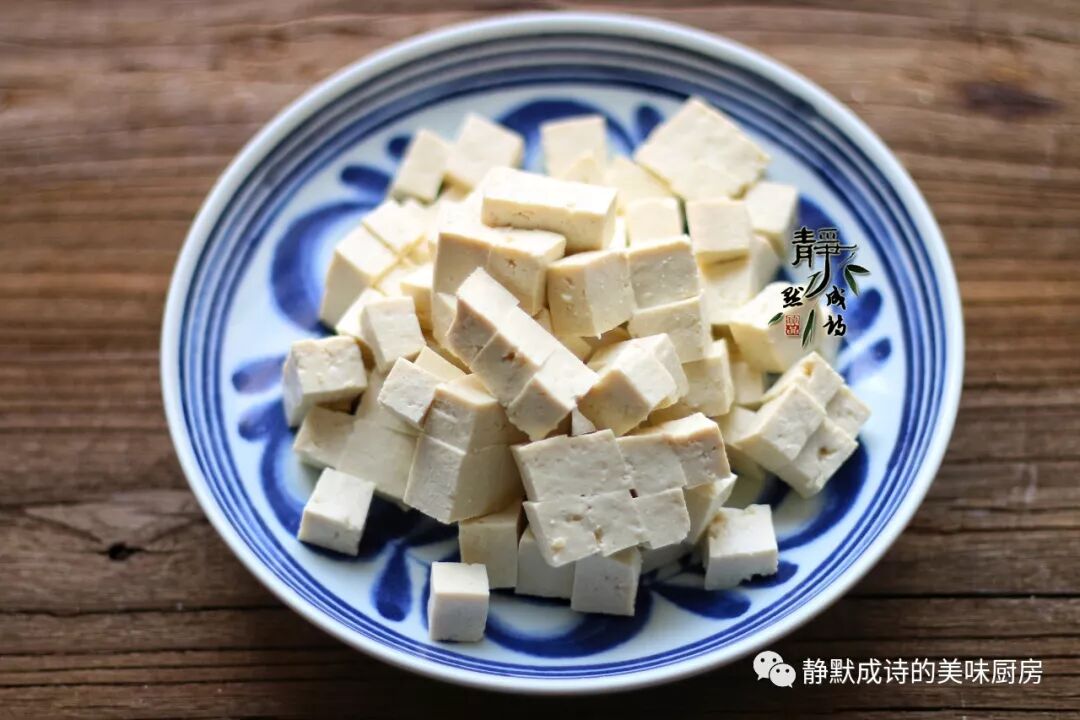 1、北豆腐切成将近1厘米左右的小块儿待用。