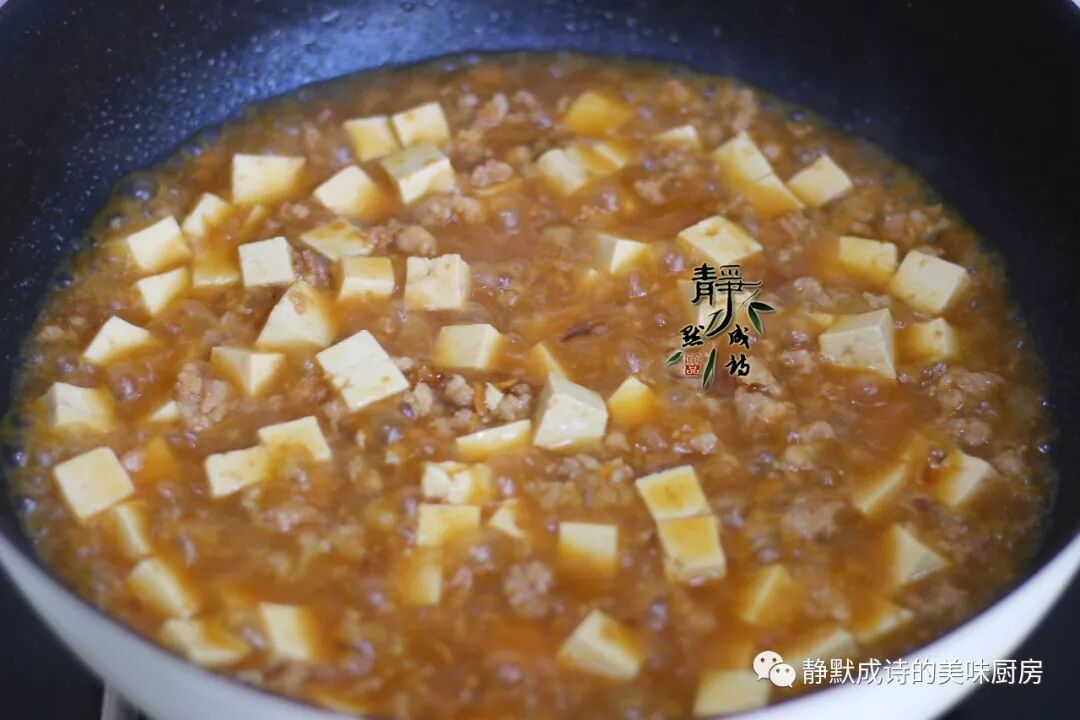8、豆腐体积会稍稍变大,几分钟后,豆腐会入味儿,转大火收汁。