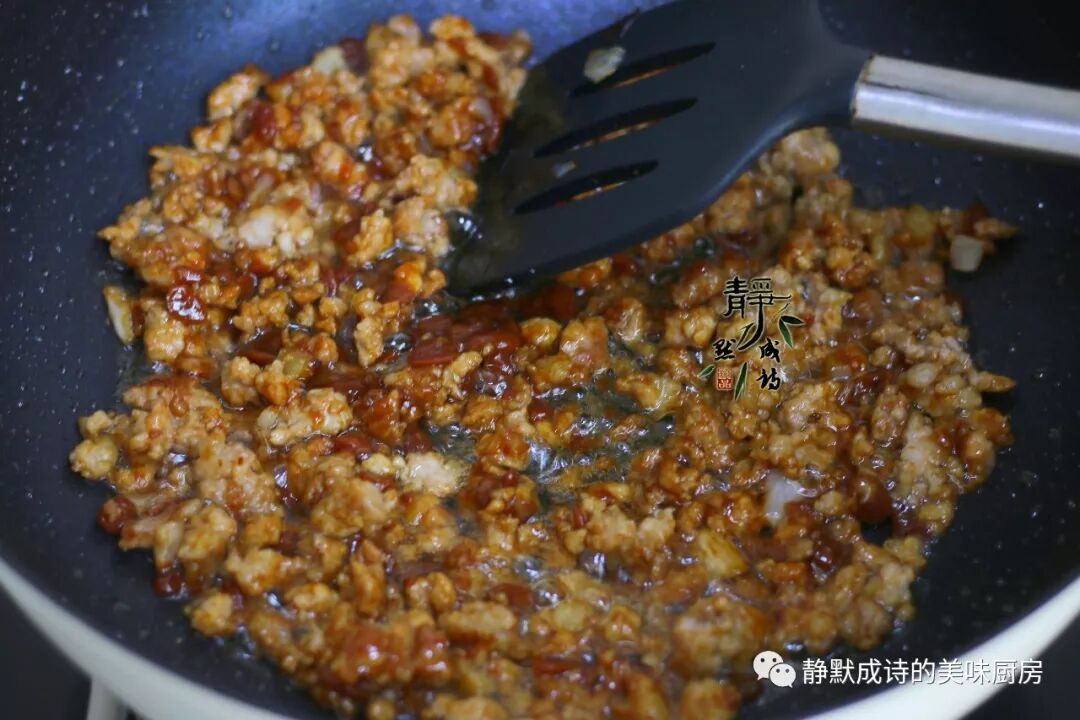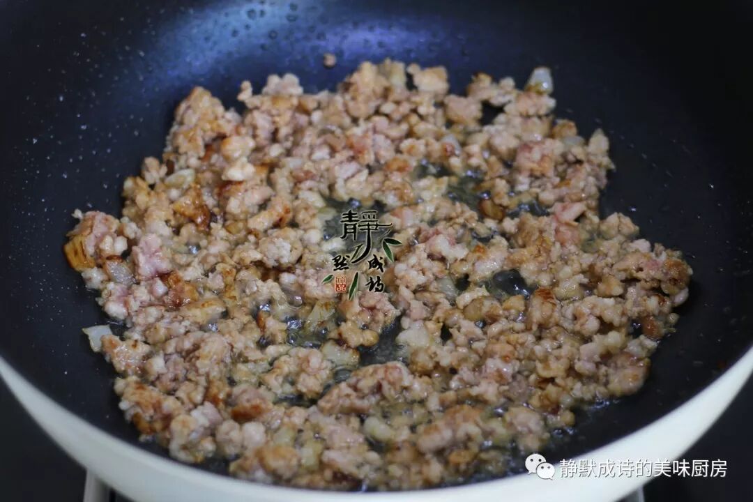 4、热锅热油,炝香葱花,下腌制过的猪肉末翻炒至变色。