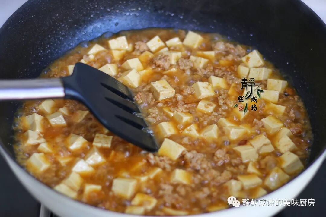 7、加入适量开水,把豆腐放进去,调入少许盐,用锅铲翻拌均匀,盖上锅盖,小火烧上几分钟。