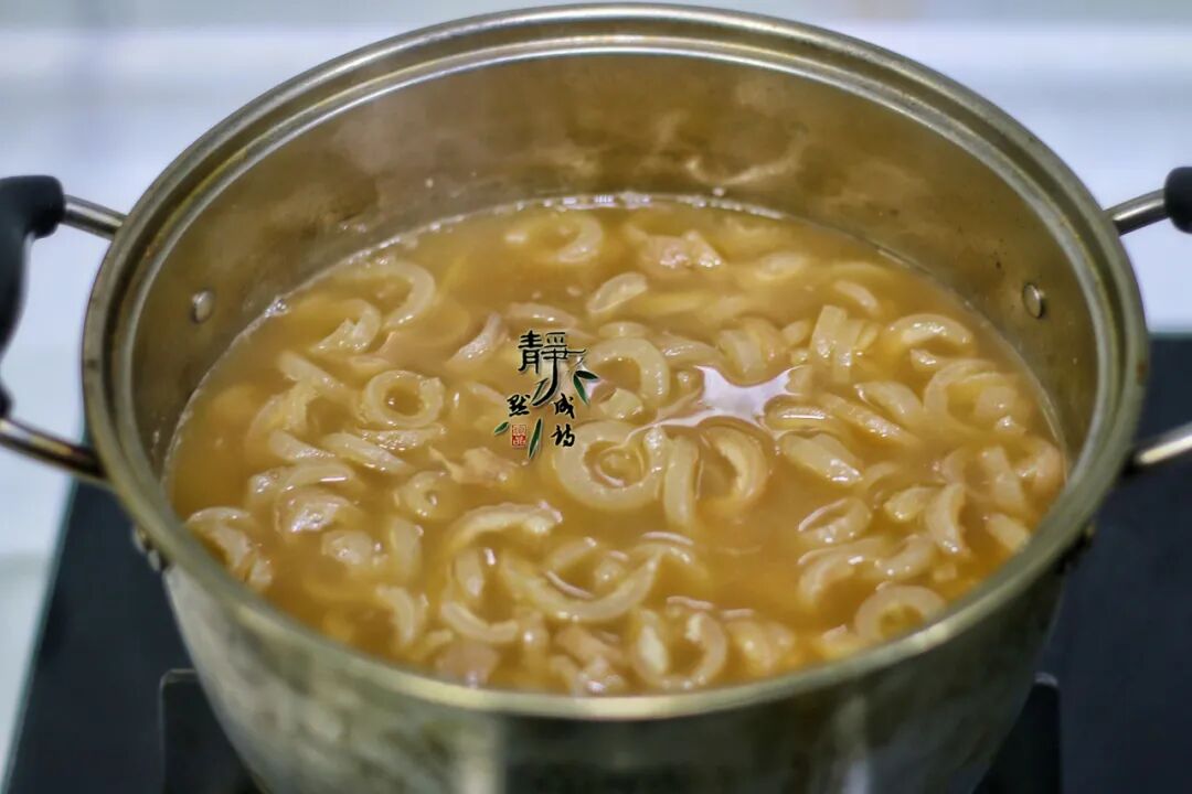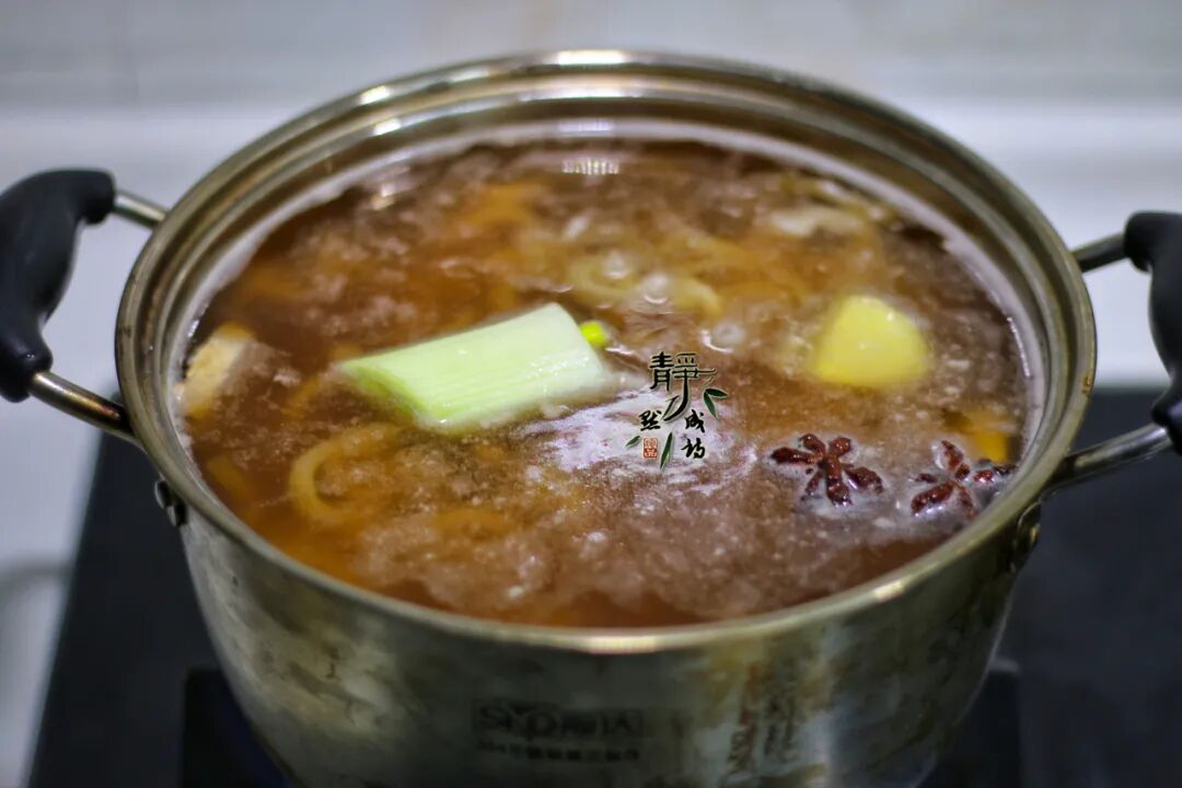 3、大火把锅中水烧开后就要调成小火慢慢来熬,不然一直大火的话,汤会浑浊变白,会影响猪皮冻的成色,猪皮冻不会有晶莹剔透的观感。