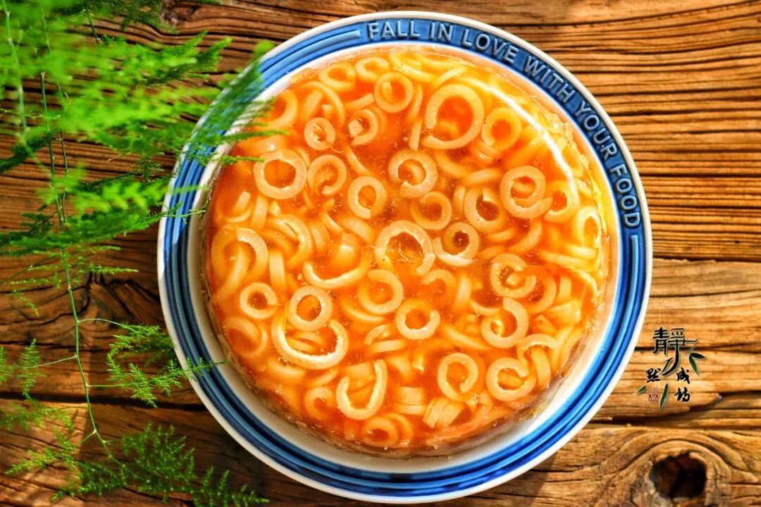 8、第二天早上就可以脱模了,吃的时候切成片,再用葱花、陈醋、香油之类的调料调个碗汁儿,蘸着吃很过瘾。这一锅,基本两三天就能消灭干净。战斗力是不是很强?其实只怪它太好吃,清香不腻,滑爽Q弹,口感特别好。