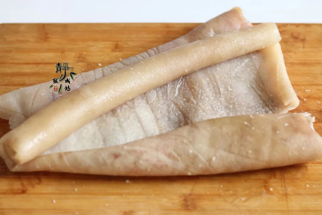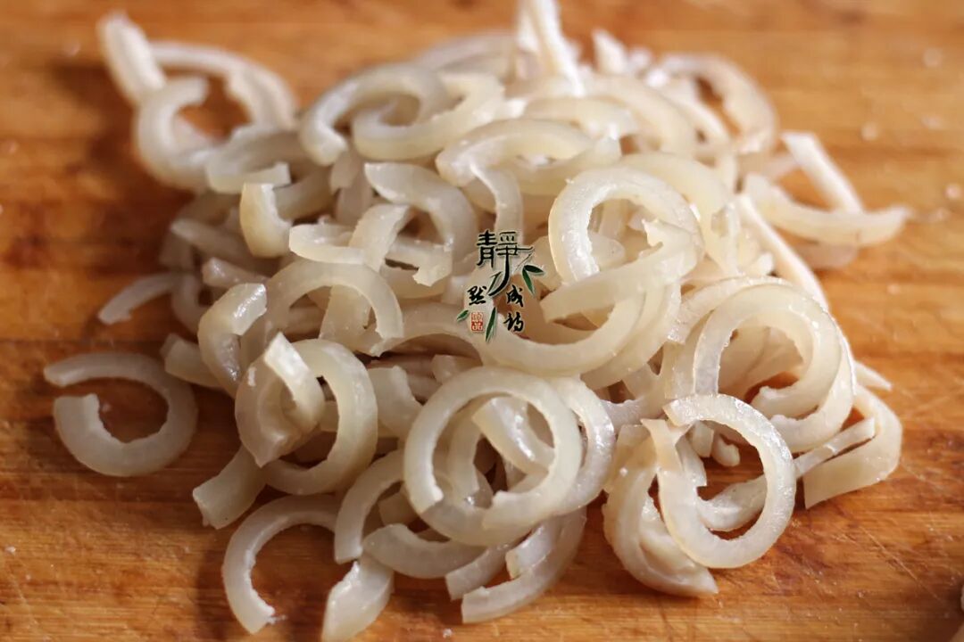 2、把收拾干净的猪皮切成小细条。切成粗条也成,这个看自己喜好而定。