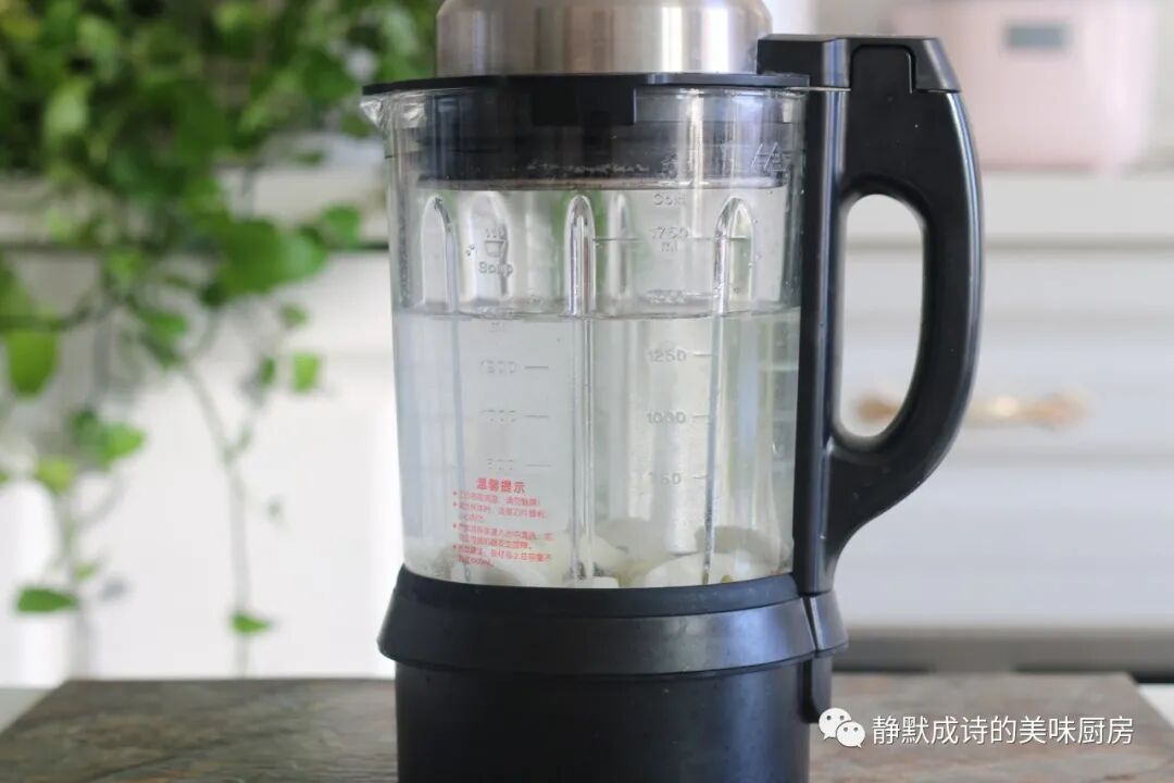 4、把铁棍山药和黄豆全部放到破壁机中,加入不超过破壁机刻度的纯净水。我放了大约1400毫升,足够全家喝。