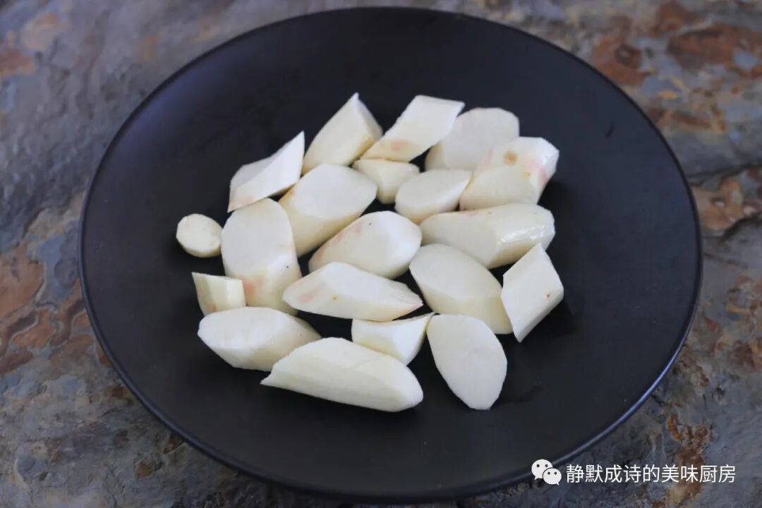 3、把铁棍山药外皮削净,切小段待用。我经常处理铁棍山药,手部皮肤的耐受度已经建立起来,所以,我都是直接操作不用手套。