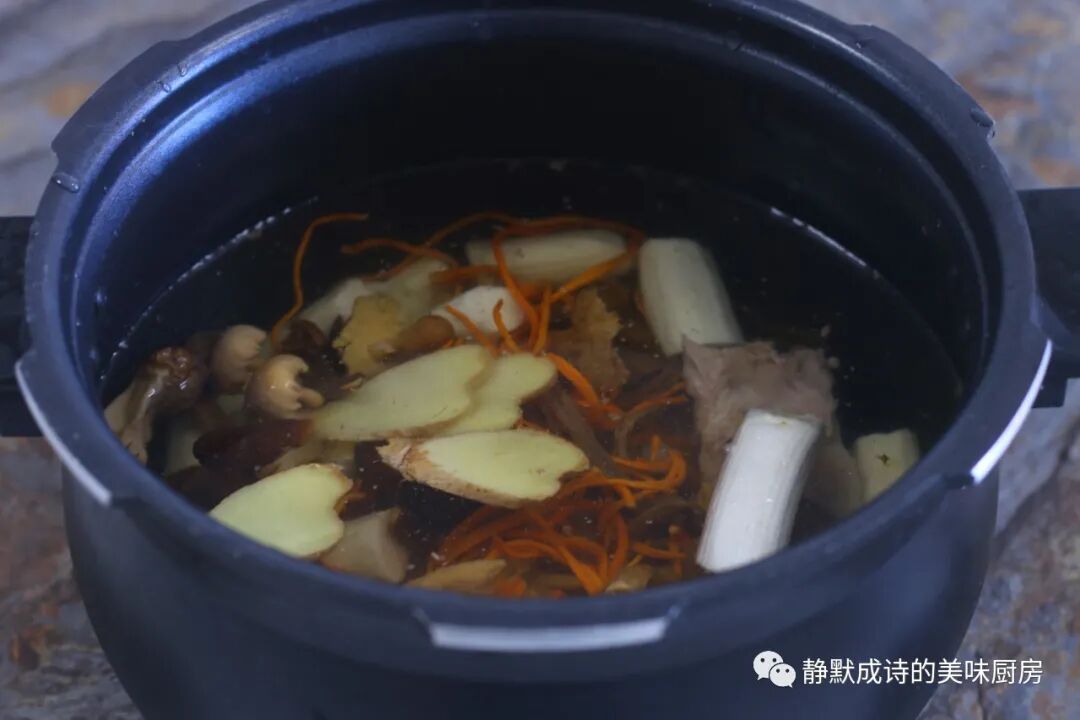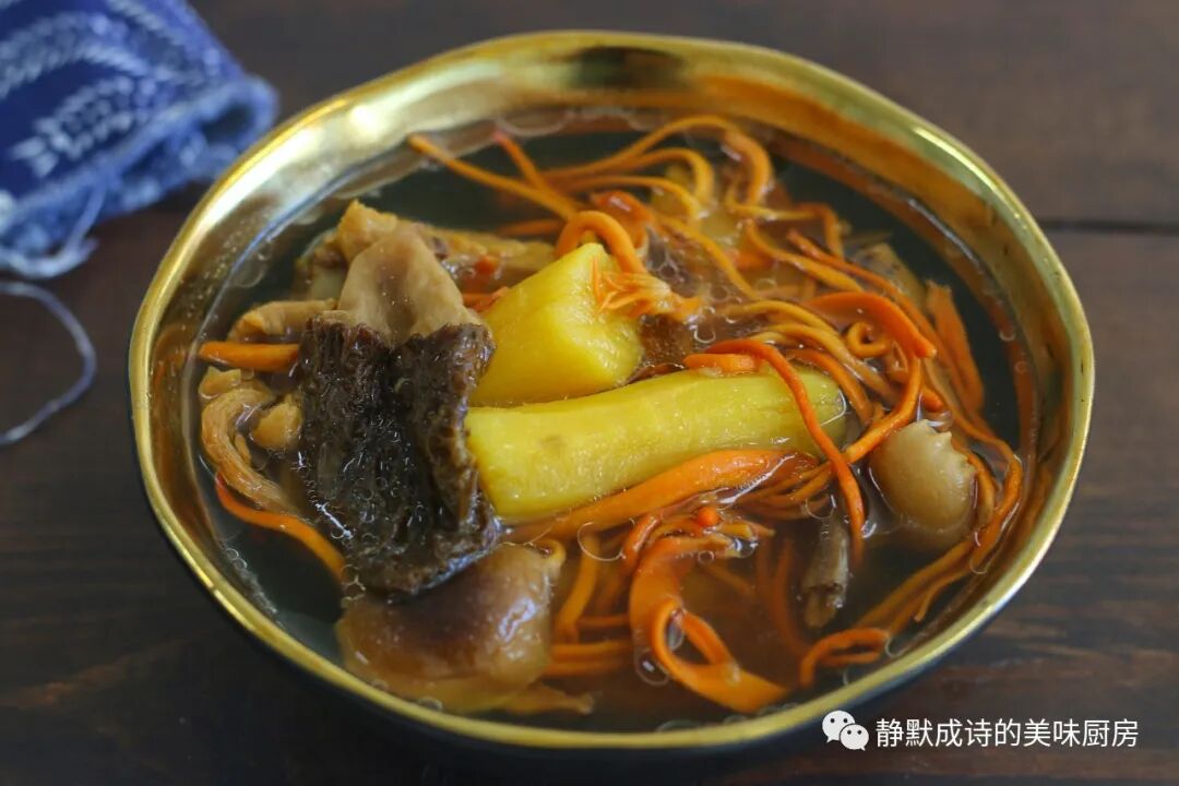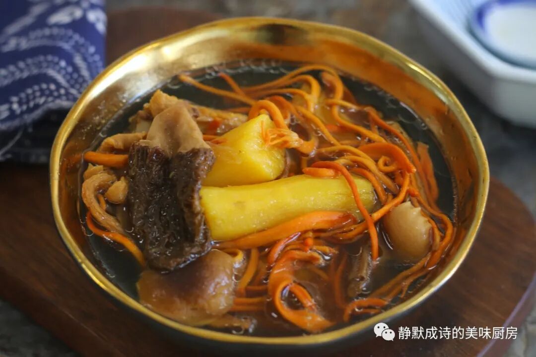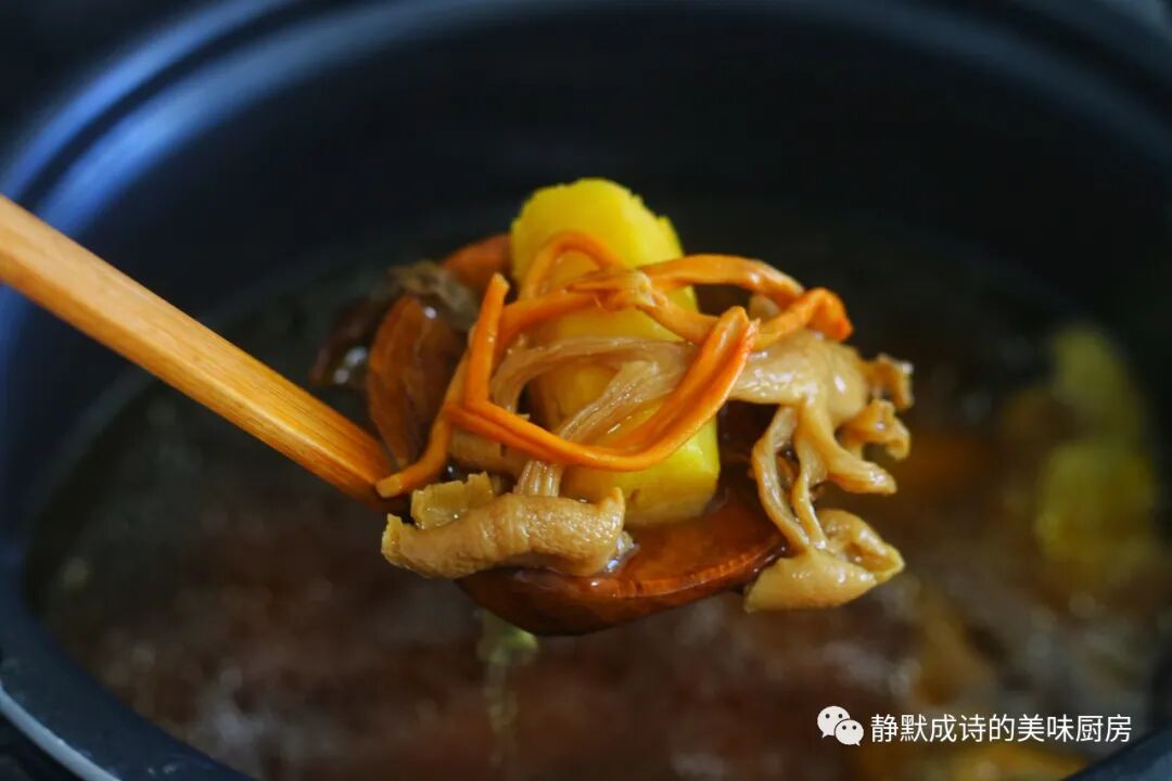 11、舀一勺看看,因为虫草花的加入,让洁白的山药变成了漂亮的金黄色,看,山药是不是相当的完整?