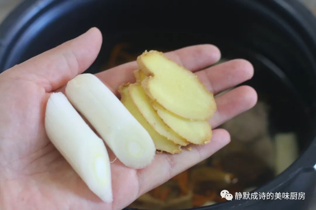 7、姜切片葱切段,也放进压力锅内胆中,再加点儿盐进去,这就是我们煲汤用的所有的调味料。