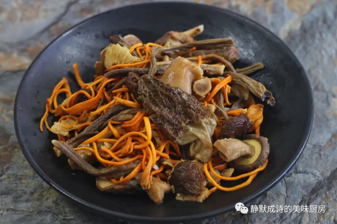 4、接下来我们把食材处理一下。菌汤包里的各种菌类提前用温水泡开,清洗两遍,攥掉水份待用。