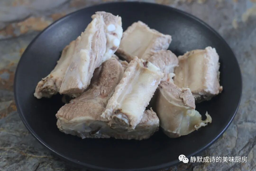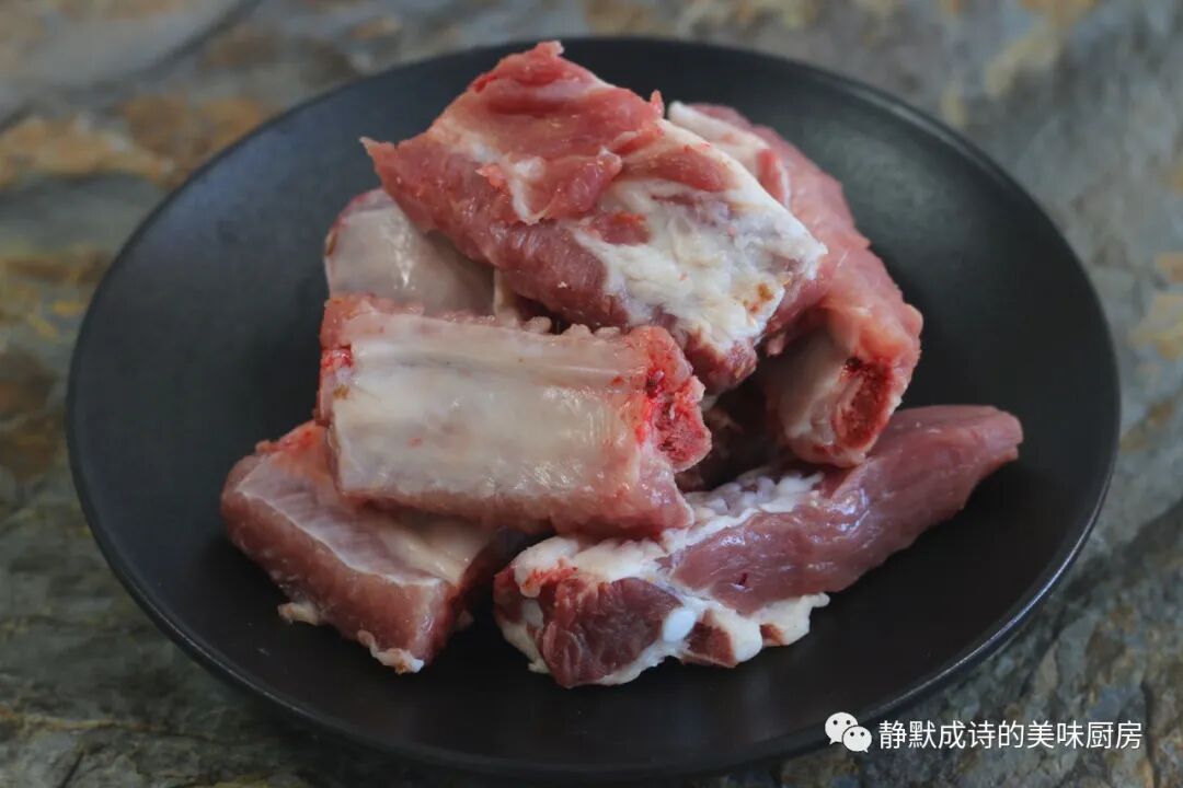 1、如前所述,肉类要少,所以这里只用到1根肋条,把它剁成小块儿,清洗干净待用。