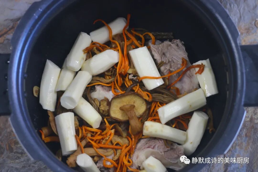 6、铁棍山药洗净,削掉外皮,切成小段,把山药、菌类、排骨全部倒进压力锅内胆。有人可能会能疑问:山药跟排骨一起下锅,后面不会烂成泥吗?其实没必要担心,因为正宗的垆土铁棍山药硬度大,既然经高压,它也会保持比较完整的外形。如果实在追求完美,那山药可以晚点儿下锅。