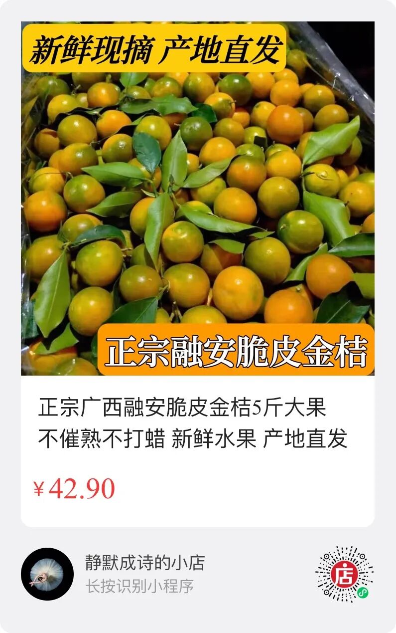 也正是因为大环境的原因,目前,融安金桔销售特别火爆,产地出现严重抢货现象。成诗小店正宗融安金桔5斤大果目前仅售42.9元(质优、价廉,买过的朋友基本都在回购),产地通知一两天内要大幅涨价。所以,强烈建议大家人手一件融安金桔。