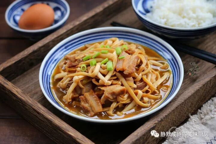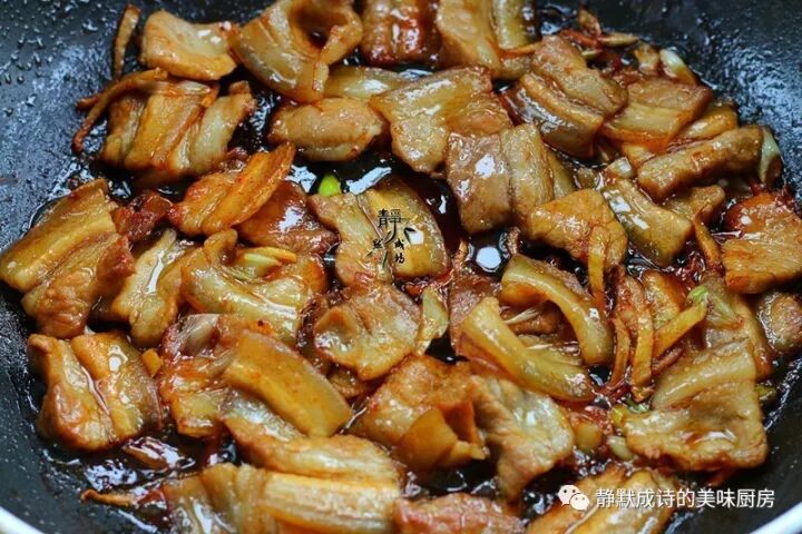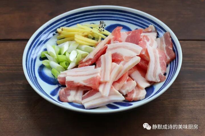 3、这是我几年前的作品,那个时候还不太注意养生问题。如今,晚上是断然拒绝五花肉的。所以,这道菜大家可以放在中午吃。不喜欢五花肉的亲们可以把它换成猪瘦肉,瘦肉切条后用生抽老抽淀粉食用油抓匀腌制一下再下锅,吃起来会很滑嫩。