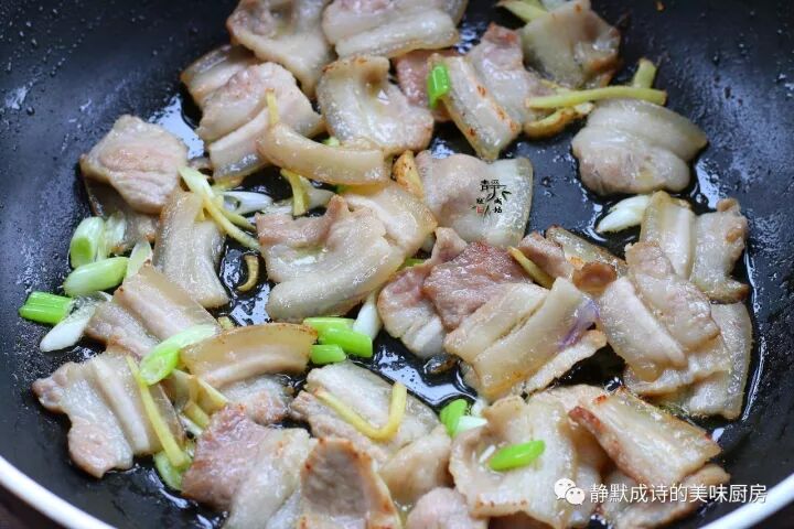 3、热锅热油,下五花肉小火煸炒出油,最好的状态是五花肉片微微卷起并有些焦黄色,然后放葱姜炒出香味。