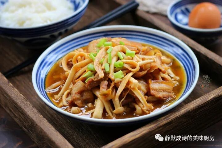 白玉菇500克、五花肉100克、葱姜少许、料酒半汤匙、酱油1汤匙、油盐适量。