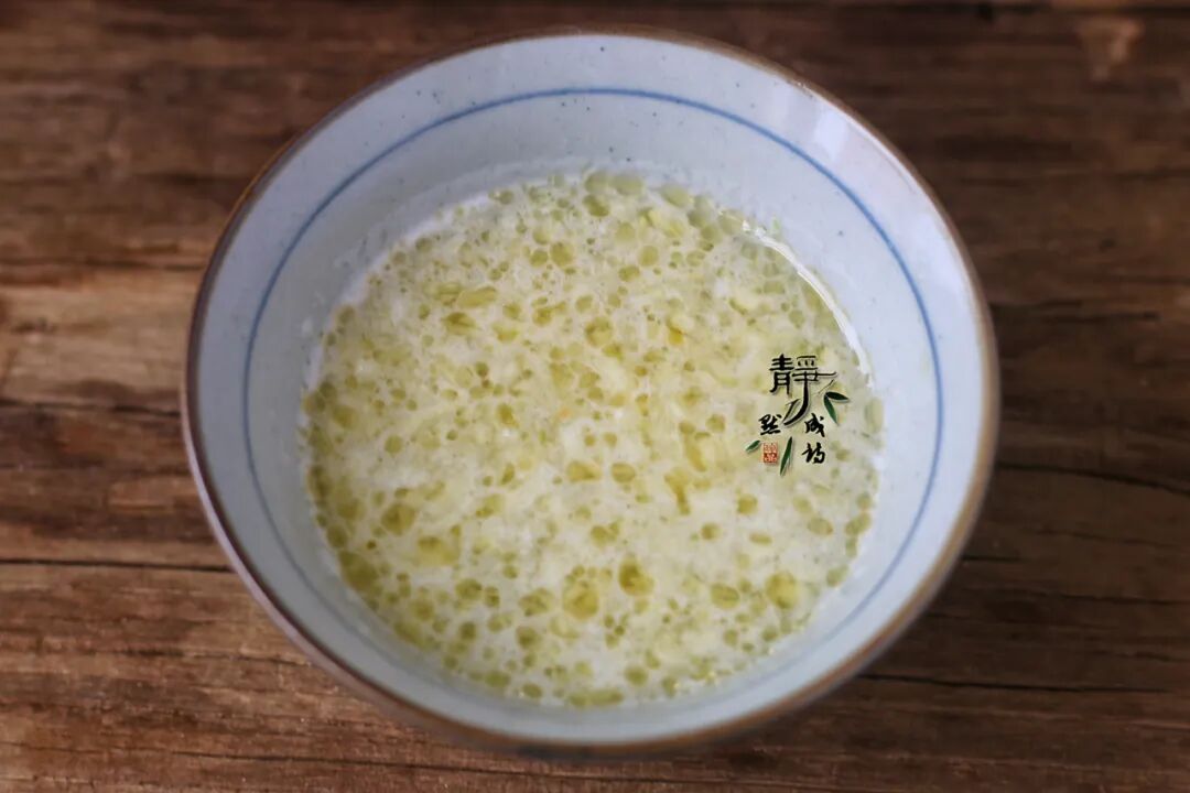 2、用纯净水把荠菜过凉并捞出;蒜加盐捣成蒜泥,再加少许清水,滴几滴香油进去搅拌均匀,蒜汁儿就准备完成。