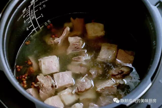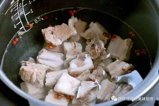 捞出羊排,放进压力锅内胆,加入几粒花椒和少许盐。同时准备好开水。