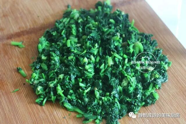 4、攥掉一些水,放案板上,然后把菠菜切碎。