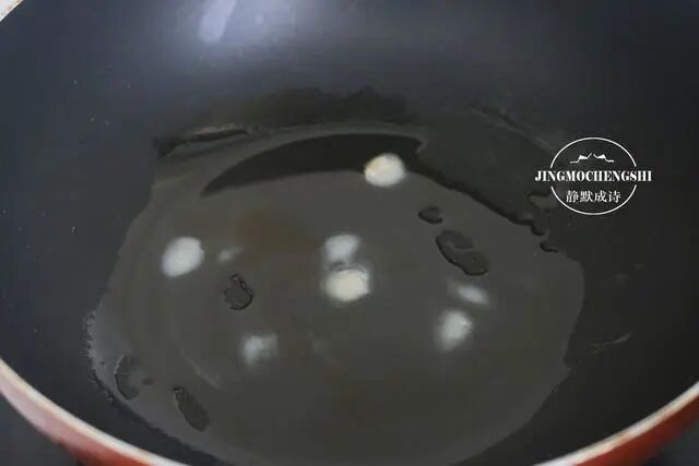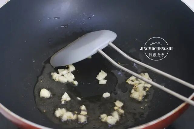 4、蒜碎同时下锅,小火炒出香味儿。蒜碎不可炒黑,影响观感。